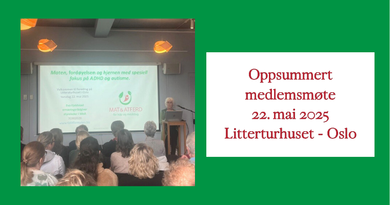 Onsdag 22. mai hadde vi medlemsmøte på Litteraturhuset i Oslo, og det ble en veldig hyggelig kveld. Rundt 40 personer møtte opp, både medlemmer og ikke-medlemmer. I tillegg til 2 fra sentralstyret og 2 fra lokalstyret Østlandet i Mat & atferd. Så det ble fullt lokale med god stemningen. Det var tydelig at mange satte pris på å treffes fysisk.